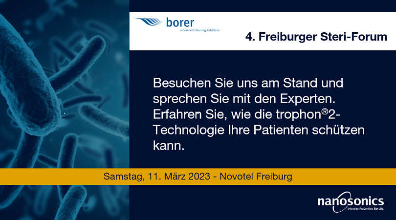 Nanosonics freut sich über die Teilnahme am 4. Freiburger Steri-Forum 2023. Wir werden darüber sprechen, wie die trophon®2 Technologie Ihre Patienten schützen kann.